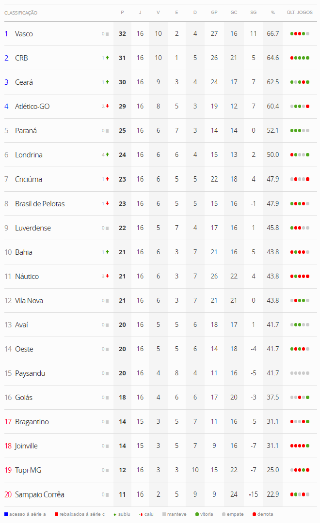 Após empatar por 1 a 1 com o Luverdense, o Vasco terminará a 16ª rodada do Brasileiro da Sére B na liderança isolada. O jogo das 21h, Bragantino x Joinville, não tem influência na parte de cima da tabela.
