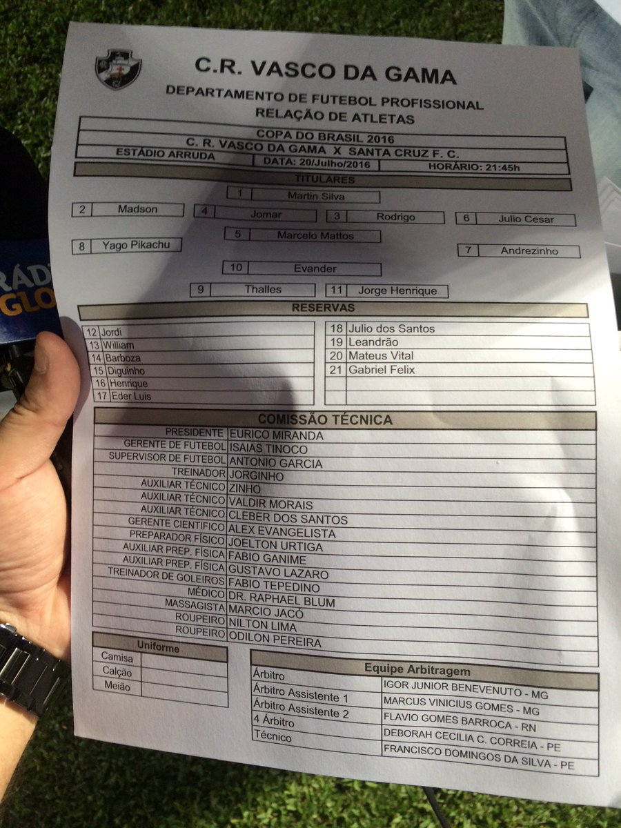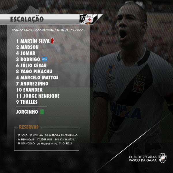 Fonte: Twitter oficial do Vasco Marco Vasconcelos @mvasconglobo Vasco escalado. Evander, Pikachu, Jomar e Thalles sãos as novidades. @futglobocbnrio