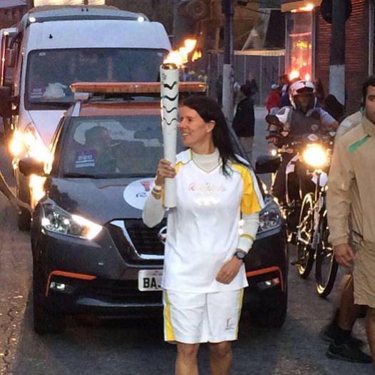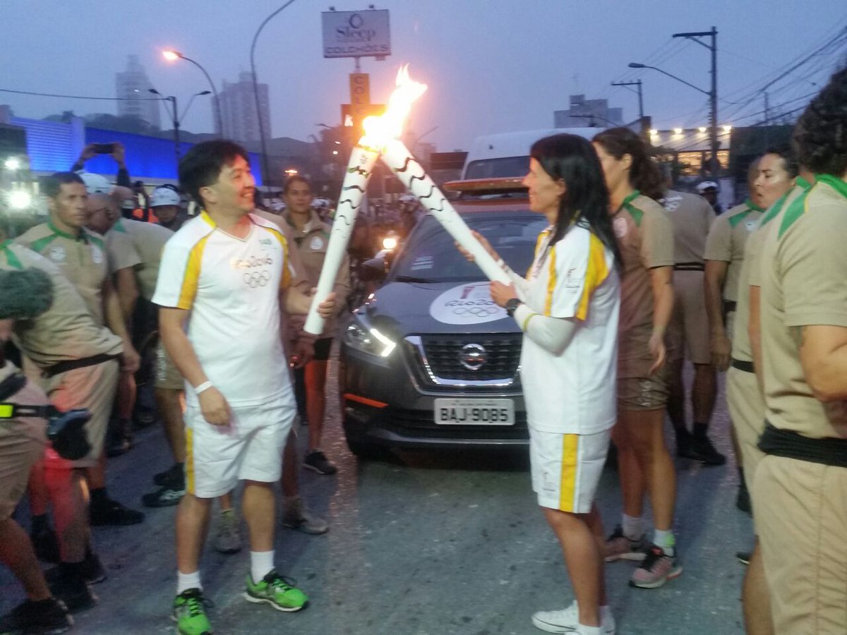 Atual téc. da sel. brasileira feminina de #TenisDeMesa, @hugohoyama passa a tocha p/ a paratleta Suzana Scharndorf.