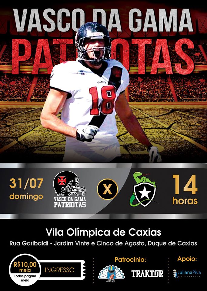 O Vasco Patriotas vai para seu segundo jogo no Campeonato Brasileiro de Futebol Americano, no dia 31/07 às 14h . Na Vila Olímpica de Caxias.
