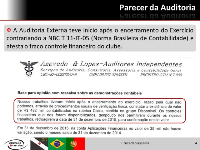 Em um dos trechos de contestação da oposição do Vasco, a auditoria aponta no parecer que “nossos trabalhos tiveram início após o encerramento do exercício, razão pela qual não podemos, através de procedimentos usuais de verificação física, constatar a existência do valor de R$ 482 mil, contabilizados na rubrica Caixa, contida no grupo Disponível. Os controles financeiros que nos foram disponibilizados, tampouco nos permitiram durante os nossos trabalhos, retroagirem à data de 31 de dezembro de 2015, para confirmação desse valor”.