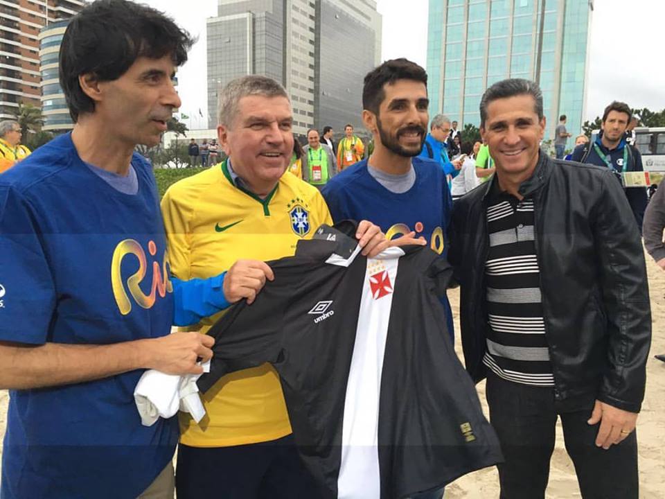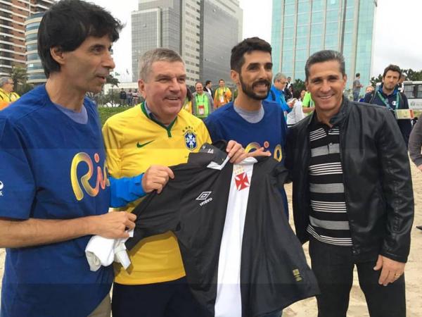 Vasco da Gama @vascodagama Presidente do COI Thomas Bach recebe camisa oficial do Vasco de M.Galvão, do técnico vascaíno e de Jorginho #Rio2016