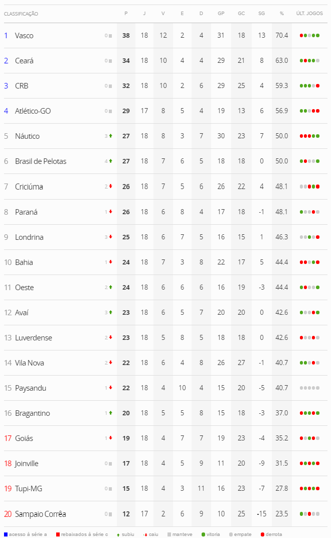 A 18ª rodada do Brasileiro da Série B ainda não terminou (o Atlético-GO recebe o Sampaio Corrêa neste domingo), mas já é possível dizer que o Vasco terminará o 1º turno da competição na liderança, pois está 4 pontos à frente do vice-líder Ceará. O Gigante da Colina também abriu 11 pontos de diferença (a maior até o momento) para o 5º colocado, atualmente o Náutico.