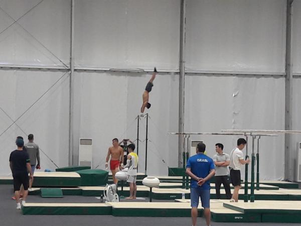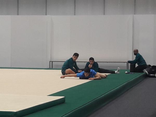 Treino da ginástica masculina do Brasil começando. Arthur Zanetti e Diego Hypolito treinaram pela manhã e foram liberados da atividade da tarde. Arthur Nory, Francisco Barretto e Sergio Sasaki estão no alongamento. Amanhã todos participam do treino de pódio às 10h30.