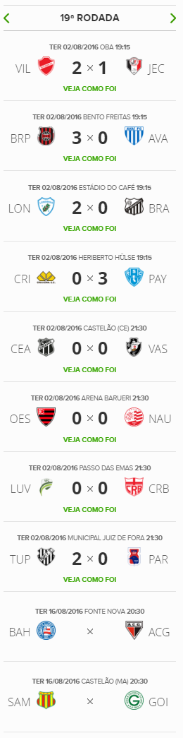 A 2 jogos do fim da 19ª rodada do Campeonato Brasileiro da Série B 2016, o Vasco, que empatou com o Ceará por 0 a 0, segue na liderança isolada da competição 4 pontos à frente do vice-líder, que é o próprio Ceará. A diferença para o 5º colocado (agora o Brasil de Pelotas) caiu de 11 para 9 pontos.