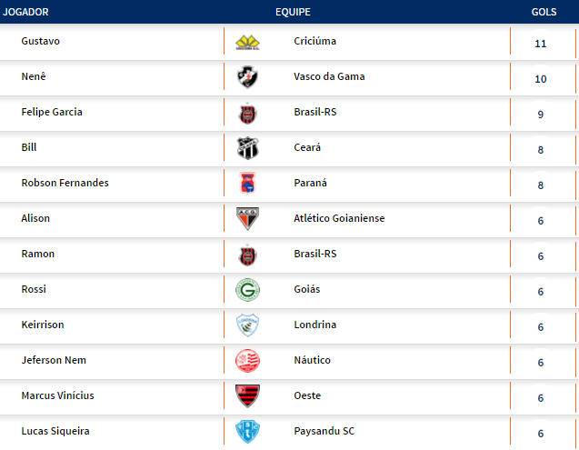 Nenê, que tem 10 gols na competição, é o vice-líder da artilharia. Gustavo, do Criciúma, tem 11 gols.
