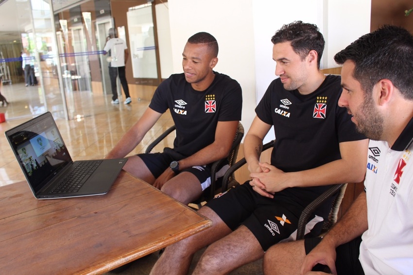 ![]() Goleiros Martín Silva e Jordi acompanham sorteio ao lado do preparador de goleiros Fábio Tepedino |