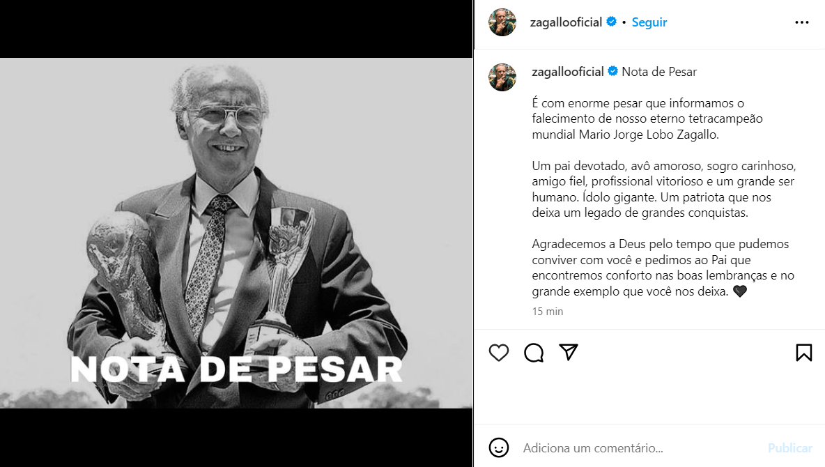 "É com enorme pesar que informamos o falecimento de nosso eterno tetracampeão mundial Mario Jorge Lobo Zagallo.