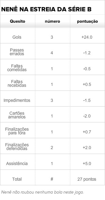 Por outro lado, são 80 pontos pelos gols e 25 pelas assistências. Claro que nem tudo é perfeito. Na rodada passada, contra o Ceará, Nenê havia acabado de se recuperar de uma lesão na coxa e não pareceu estar 100% em campo. Teve uma atuação ruim. E se estivesse no Cartola teria negativado: -0.9. A conta: sete passes errados (-2.1), uma falta cometida (-0.5), quatro faltas recebidas (+2.0), uma roubada de bola (+1.7) e um cartão amarelo (-2.0).