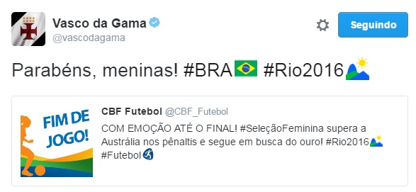 Pelo Twitter, Vasco parabeniza Seleção Brasileira Feminina por classificação à semifinal olímpica