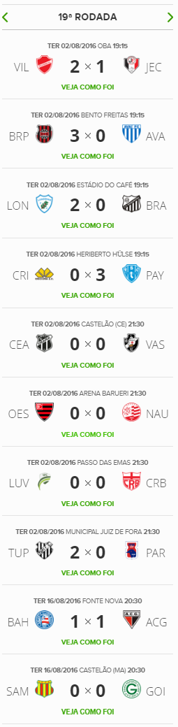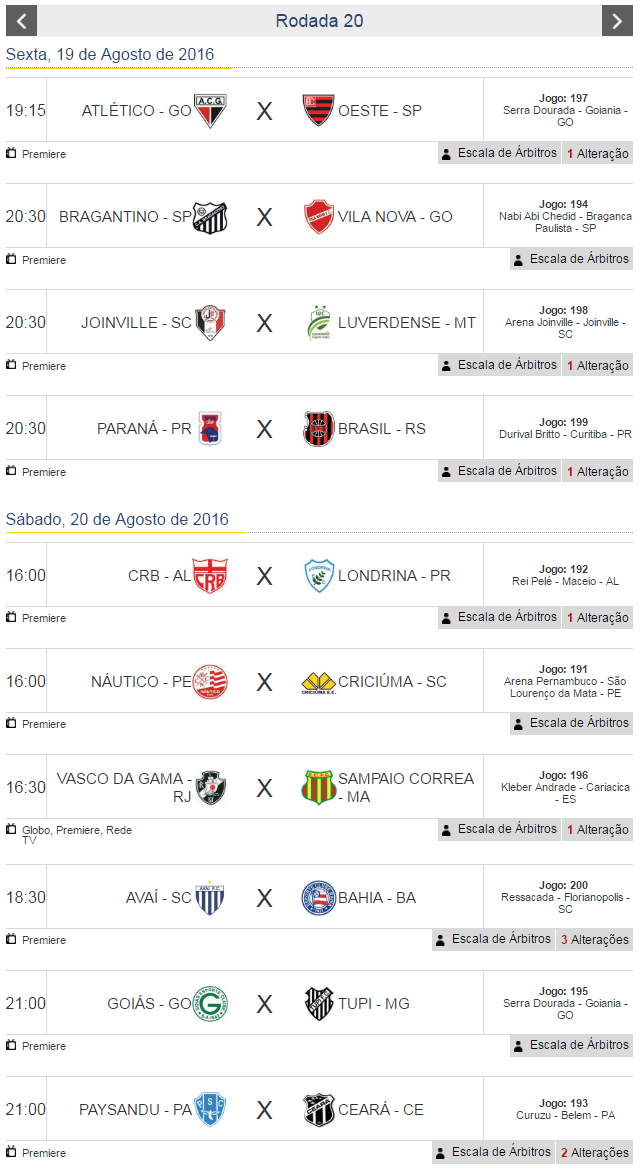 O 1º turno do Campeonato Brasileiro da Série B 2016 terminou apenas nesta 3ª-feira (16/08) com os jogos Bahia 1 x 1 Atlético-GO e Sampaio Corrêa 0 x 0 Goiás.