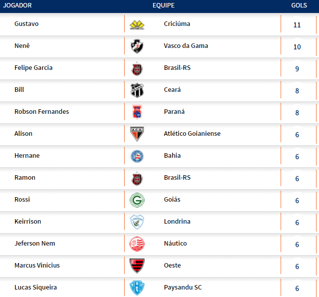 Nenê, que tem 10 gols na competição, é o vice-líder da artilharia. Gustavo, do Criciúma, tem 11 gols.