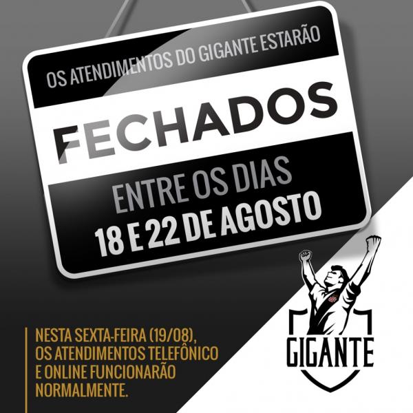 Por conta dos próximos feriados na cidade do Rio de Janeiro, o atendimento do Gigante não funcionará entre esta quinta-feira (18/08) e a próxima segunda-feira (22/08).