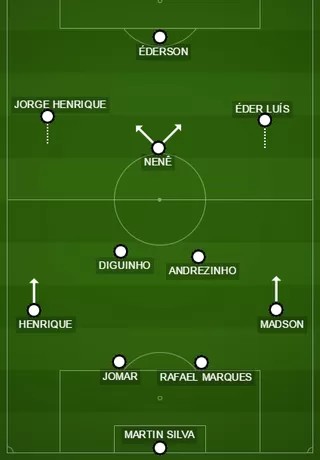 No início, tudo saiu como o planejado. Andrezinho melhorou a saída de bola. Mais recuado, o meia dava condições para os laterais Madson e Henrique apoiarem ao ataque. Nesse caso, Jorge Henrique e Éder Luís também ficavam encarregados de ajudar na marcação. Na primeira jogada de ataque, Éder serviu Madson pela direita, que cruzou rasteiro, mas Nenê não aproveitou.