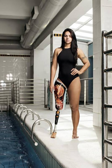 Aos 24 anos, a nadadora Camille Rodrigues (com sua estilosa prótese de perna tatuada) se prepara para disputar a primeira Paralimpíada