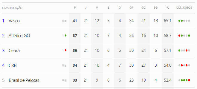 O empate (2 a 2) contra o Tupi mantém o Vasco ainda folgado na liderança da Série B, 4 pontos à frente do vice-líder Atlético-GO e 8 à frente do 5º colocado Brasil de Pelotas. O jogo Bahia x Paraná está em andamento e Luverdense x Bragantino começa às 21h, mas nenhum dos 2 resultados influi nas primeiras colocações.