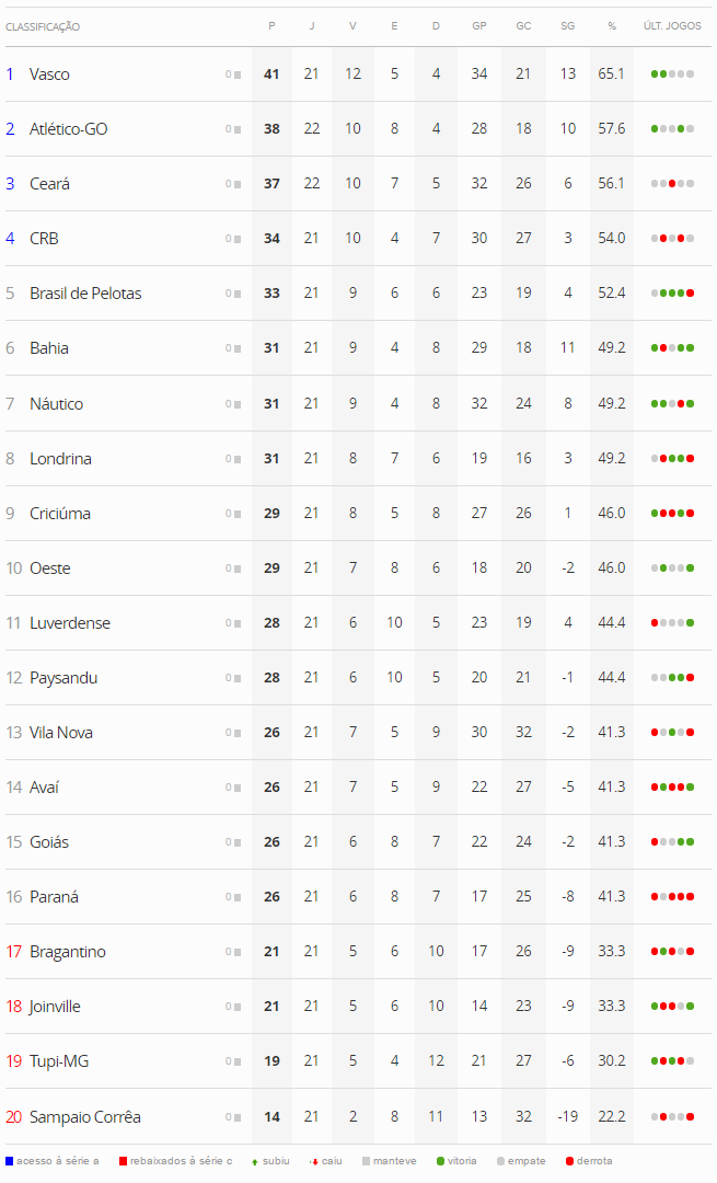 O empate por 2 a 2 entre o vice-líder do Brasileiro da Série B Atlético-GO e o 3º colocado Ceará, na noite de 2ª-feira (29/08), em Goiânia, deixou o Vasco em condições de abrir 6 pontos na liderança da competição caso vença o Vila Nova, nesta 3ª-feira (30/08), em São Januário. Veja a classificação parcial: