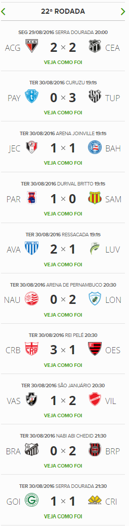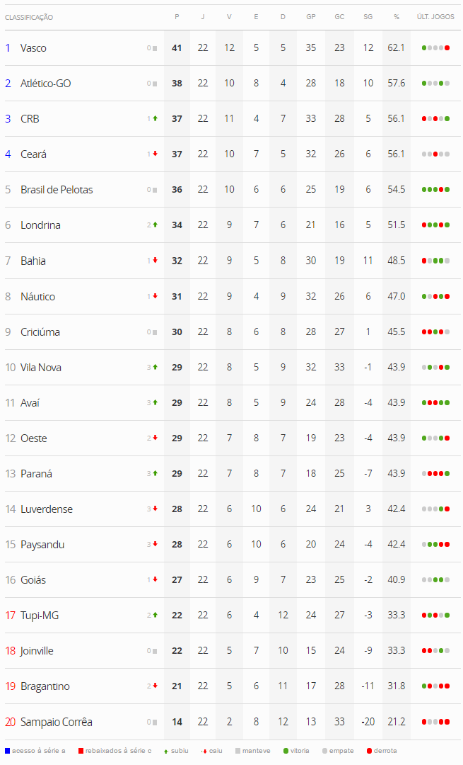 Terminada a 22ª rodada do Campeonato Brasileiro da Série B 2016, o Vasco, que perdeu para o Vila Nova por 2 a 1, segue na liderança isolada da competição, agora 3 (e não mais 4) pontos à frente do vice-líder (Atlético-GO). A diferença para o 5º colocado (Brasil de Pelotas) caiu de 8 para 5 pontos.