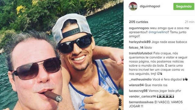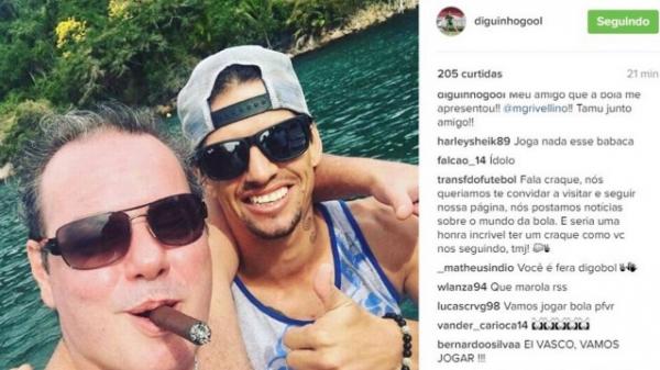 Após mais uma derrota do Vasco na Série B do Campeonato Brasileiro, desta vez para o Bahia, o volante cruz-maltino Diguinho aproveitou a folga de domingo em Angra dos Reis com o amigo Marcio Rivellino e meia Marquinho, do Fluminense.