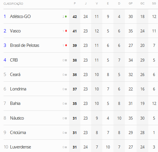 O Atlético-GO venceu o Luverdense por 2 a 0 na noite desta terça-feira (06/09) pela 24ª rodada da Série B. Com o resultado, a equipe foi a 42 pontos e ultrapassou o Vasco na tabela de classificação. Os vascaínos jogam pela 24ª rodada no próximo sábado (10/09), contra o Oeste, em São Januário.