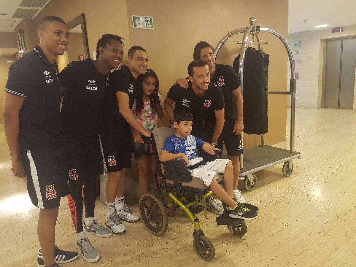 Jogadores do Vasco desceram ao saguão do hotel para tirar foto com o Gustavo, de sete anos. #gevas