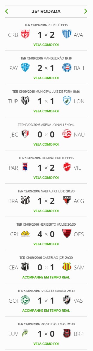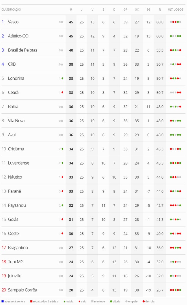 Terminada a 25ª rodada do Campeonato Brasileiro da Série B 2016, o Vasco, que empatou com o Goiás por 1 a 1, segue na liderança da competição, com o mesmo número de pontos do vice-líder (Atlético-GO), mas com 1 vitória a mais. A diferença para o 5º colocado (Londrina) aumentou de 6 para 7 pontos.