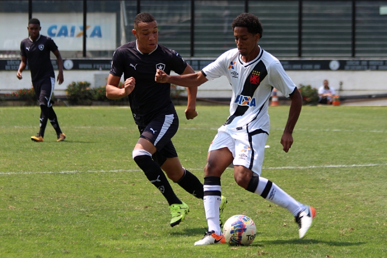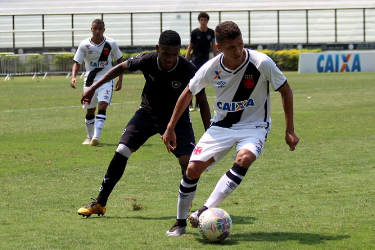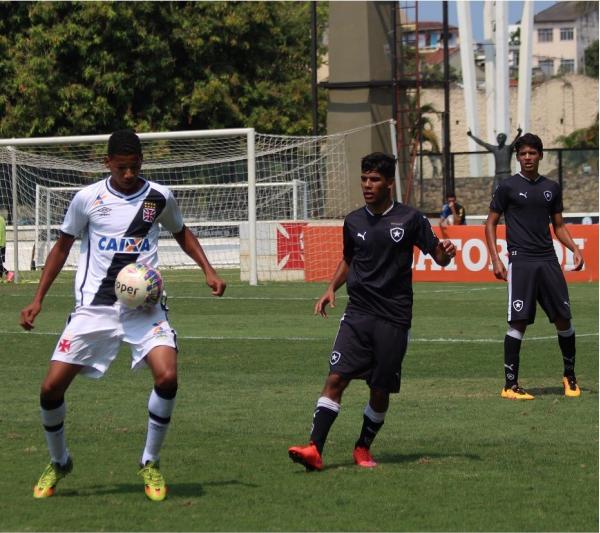 Reforçado pelo treinador Marcus Alexandre, que não comandou o time nas últimas partidas em virtude de um problema de saúde, o sub-17 do Vasco partiu para cima do Botafogo nos primeiros minutos. A primeira boa oportunidade, porém, foi Alvinegra. Os visitantes assustaram em boa jogada pela esquerda, que terminou em finalização rente a trave do goleiro Alexander. A resposta cruzmaltina veio antes da parada. Pedro escapou pela direita e cruzou na direção da grande área. Paulinho desviou, a bola tocou no travessão e no rebote Breno cabeceou em cima do arqueiro rival.