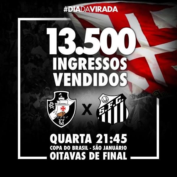 Já foram vendidos 13.500 ingressos para o confronto decisivo entre Vasco e Santos, pelo jogo de volta das oitavas de final da Copa do Brasil, na quarta-feira (21/09), às 21h45, em São Januário. Os bilhetes de arquibancada já estão esgotados para os torcedores vascaínos. Restam lugares no Setor VIP e também para os sócios na Cadeira Social.