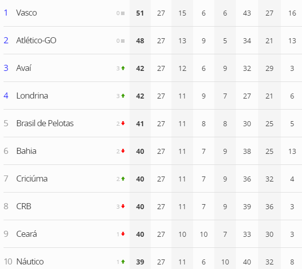 O Vasco venceu o Atlético-GO por 2 a 0 e segue na liderança da Série B, agora com 3 pontos a mais que o vice-líder (o próprio Atlético-GO). A diferença para o 5º colocado aumentou de 9 para 10 pontos.