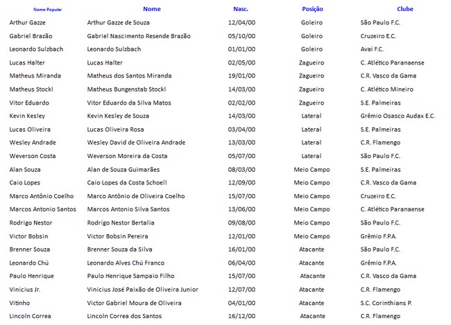 Foram relacionados 23 jogadores. Eles se apresentam no dia 30 deste mês e seguem direto para a Índia. O Brasil pega a China no dia 5 de outubro, folga na rodada seguinte, enfrenta a Rússia no dia 9, a África do Sul no dia 11 e os donos da casa no dia 13.
