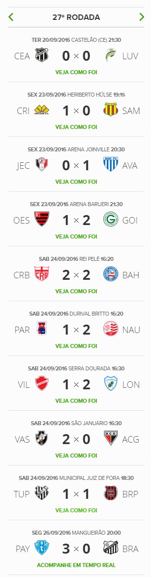 Terminada a 27ª rodada do Campeonato Brasileiro da Série B 2016, o Vasco, que venceu o Atlético-GO por 2 a 0, segue na liderança da competição, aumentando de 0 para 3 pontos a mais que o vice-líder (Atlético-GO). A diferença para o 5º colocado (Brasil-RS) aumentou de 9 para 10 pontos.