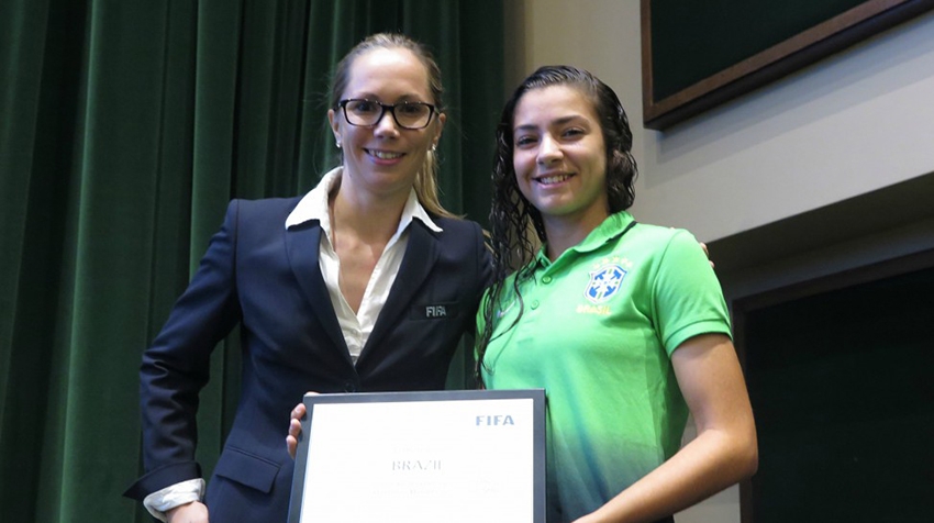 A seleção brasileira sub-17 feminina já está na Jordânia para a disputa da Copa do Mundo. Capitã do time comandado pelo técnico Luiz Antônio, a volante vascaína Angelina é um dos grandes nomes da competição. A FIFA realiza uma reunião oficial de chegada em todas as edições do Mundial. Dona da braçadeira, Angelina recebeu da representante da FIFA, Erika Sowon, uma placa de boas vindas ao Brasil, parabenizando pela classificação a Copa do Mundo. As outras jogadoras do elenco ganharam certificados de participação no torneio.