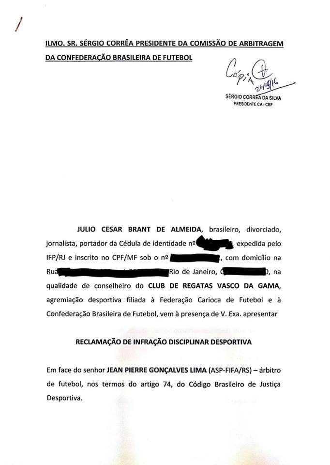 Depois de ingressarmos, no STJD, com uma Denúncia contra o árbitro Jean Pierre Gonçalves Lima, apresentamos, no dia 26 próximo passado, na CBF, uma Reclamação de Infração Disciplinar Desportiva contra o mesmo árbitro. Após esta representação, Jean Pierre não foi escalado.