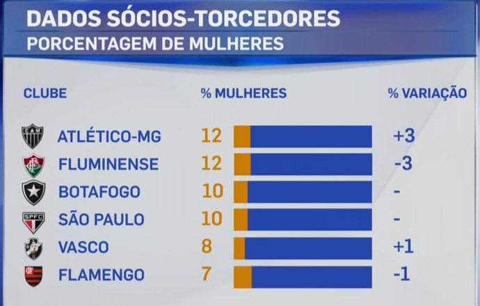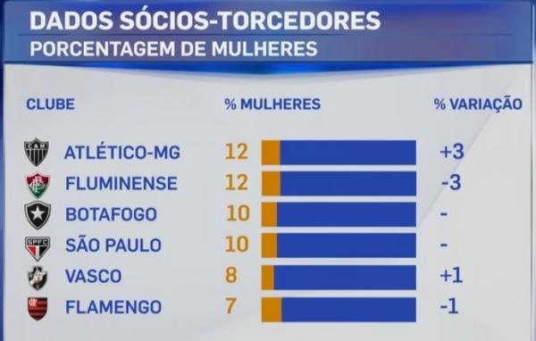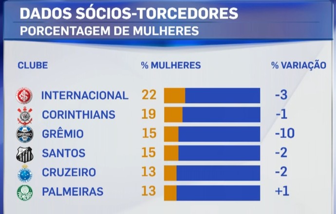 O jornalista Rodrigo Capelo, da Revista Época, fez um levantamento a respeito dos sócios-torcedores e apontou para um dado importante: apenas um décimo do total dos programas dos 12 clubes mais populares do país é de mulheres. O clube com maior participação feminina entre seus sócios é o Internacional, com 22%, seguido pelo Corinthians, com 19%. O Flamengo, clube de maior torcida do país, é o que tem o menor percentual, com 7% (assista ao vídeo).