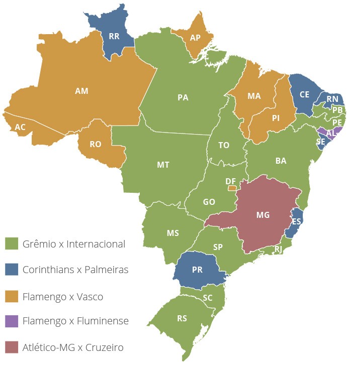 O mais curioso é dividir as escolhas por estado. É interessante ver que o Gre-Nal venceu em 12 locais: Bahia, Goiás, Mato Grosso, Mato Grosso do Sul, Pará, Paraíba, Pernambuco, Rio de Janeiro, Rio Grande do Sul, Santa Catarina, São Paulo e Tocantins.