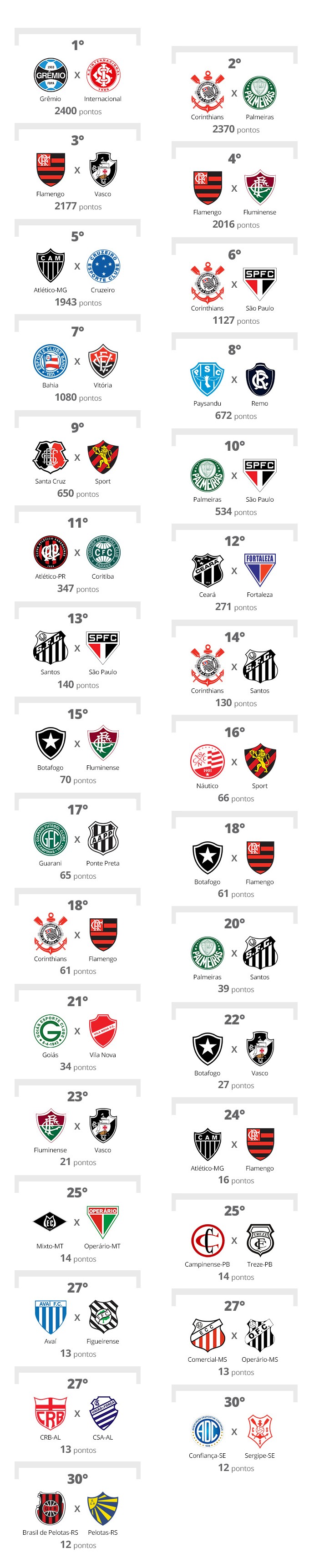 O ranking final teve Grêmio x Internacional como o maior clássico do Brasil, seguido muito perto por Corinthians x Palmeiras. Flamengo x Vasco, Flamengo x Fluminense e Atlético-MG x Cruzeiro completam o Top 5.