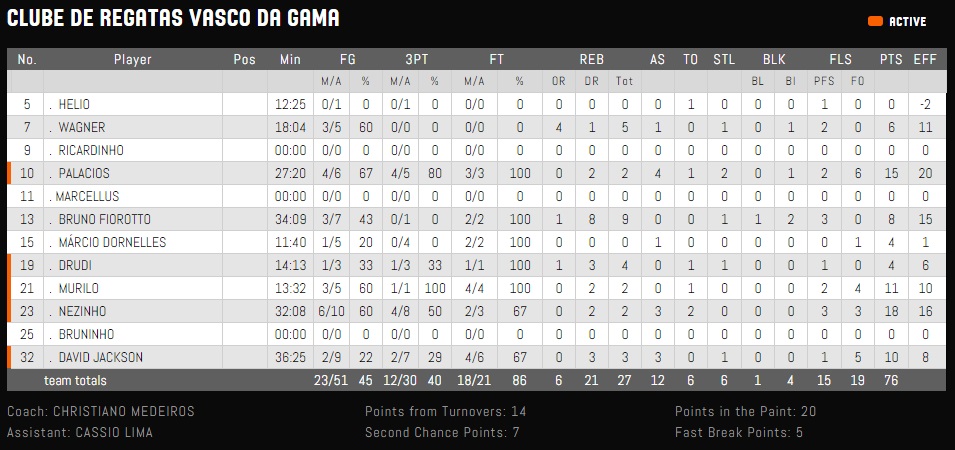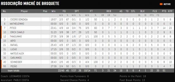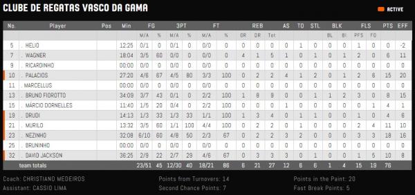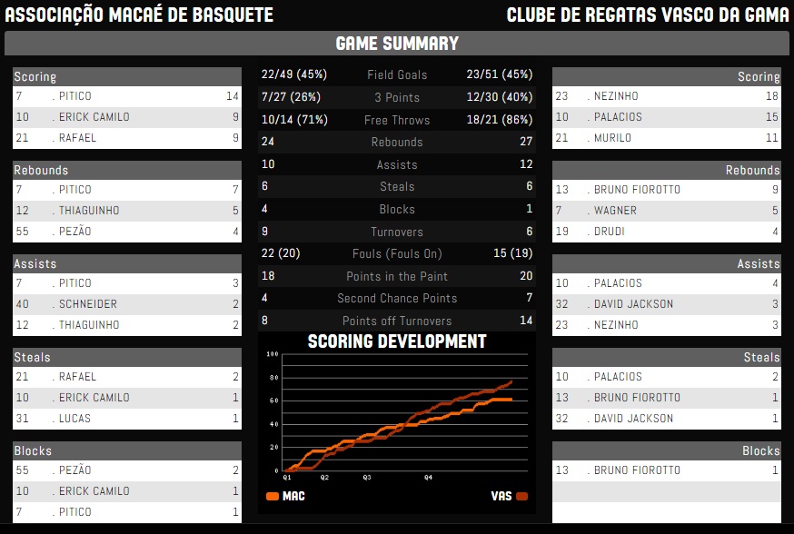 O Macaé até deu trabalho nos dois primeiros quartos. Com uma forte defesa, terminou à frente, vencendo por 27 a 23. No entanto, Nezinho e Palacios comandaram a reação no terceiro e deixaram o Vasco em vantagem por 50 a 39.
