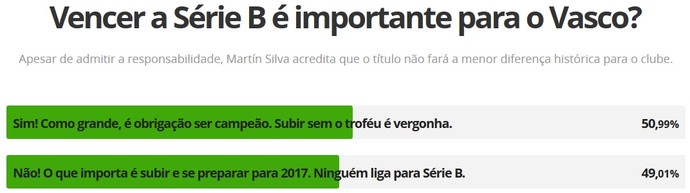 Martín Silva deu a deixa, e o GloboEsporte.com levantou a questão para torcida do Vasco: ser campeão da Série B do Brasileirão é realmente importante? O resultado diz que sim, mas a diferença de somente 1,8% dos mais de 30 mil votos mostra uma sintonia com o goleiro, que, apesar de admitir a responsabilidade como time grande, considera que o troféu em nada agregará na história centenária do clube cruz-maltino. Ao todo, 30.656 torcedores deram sua opinião ao longo de uma semana, com 50,99% na opção "Sim! Como grande, é obrigação ser campeão. Subir sem o troféu é vergonha" e 49,01% para "Não! O que importa é subir e se preparar para 2017. Ninguém liga para Série B".