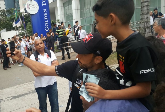 A delegação do Vasco chegou a vitória no fim da tarde desta sexta-feira e se deparou com diferentes tipos de recepção. No hotel em que os jogadores estão hospedados, membros de uma torcida organizada atiraram notas de dinheiro falsas com o rosto de Eurico Miranda no momento em que os cruz-maltinos desciam do ônibus e gritaram palavras de ordem contra o presidente vascaíno. Por outro lado, outros torcedores, especialmente mirins, só queriam saber de uma foto com Nenê.