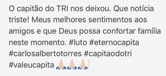 Em rede social, Julio Cesar lamenta morte do ex-jogador Carlos Alberto Torres