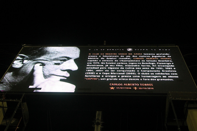 Antes da partida contra o Avaí, na noite desta quarta-feira (26/10), em São Januário, os jogadores vascaínos entraram em campo com uma camisa especial e personalizada com o número 4, em homenagem ao eterno capitão da Seleção Brasileira, Carlos Alberto Torres, que faleceu na última terça-feira (25/10). Ainda antes do jogo, um minuto de silêncio foi respeitado pelo falecimento deste grande atleta. No placar, foi relembrado o último gol da Copa do Mundo de 1970, de autoria do eterno "Capita".