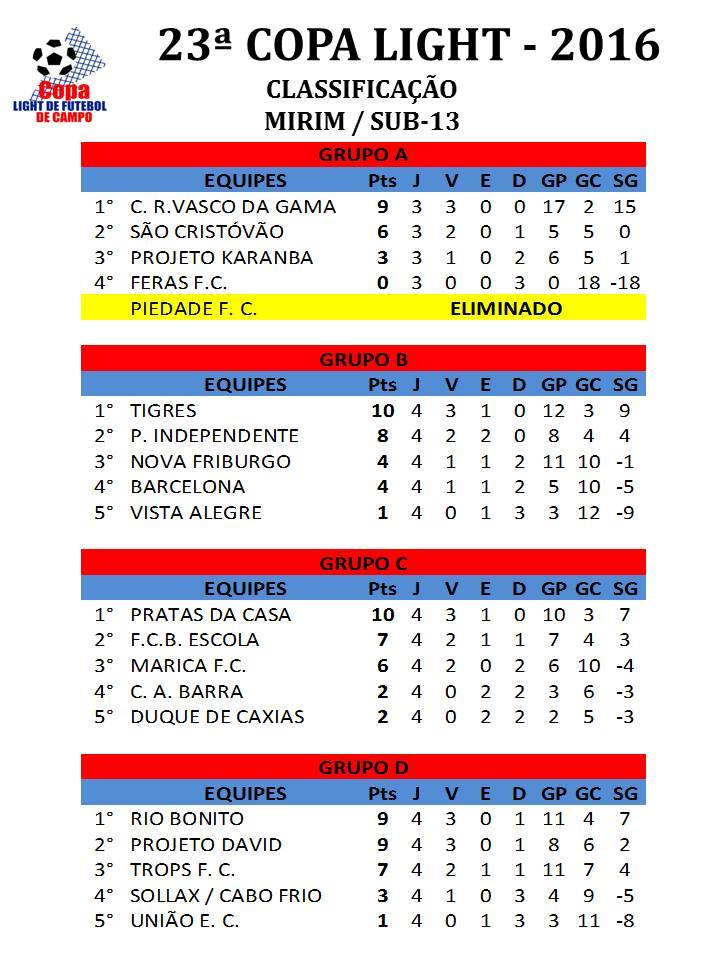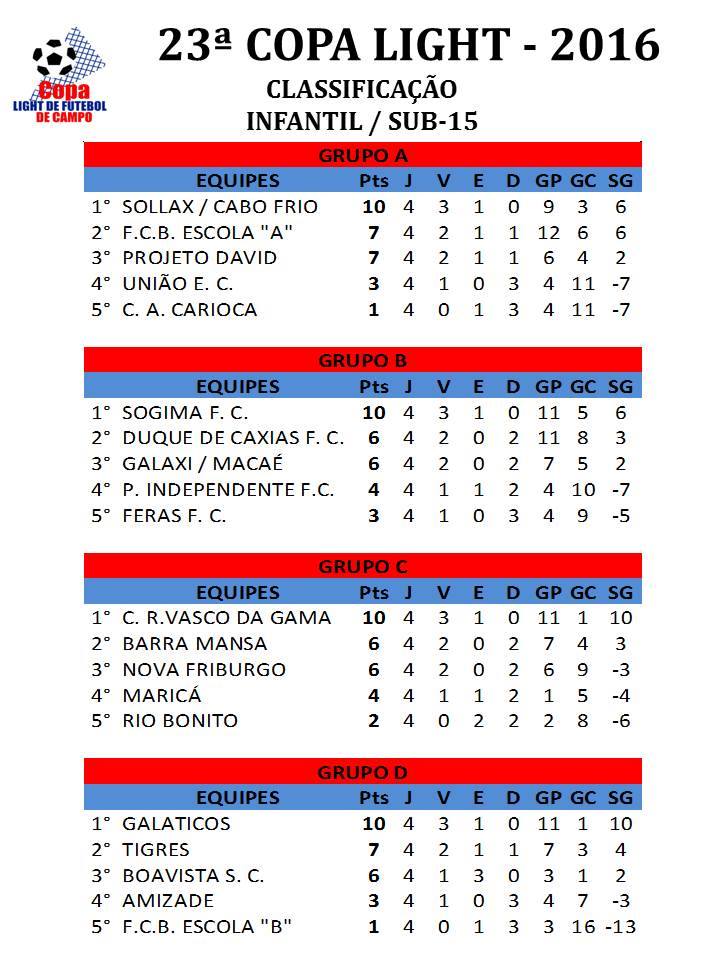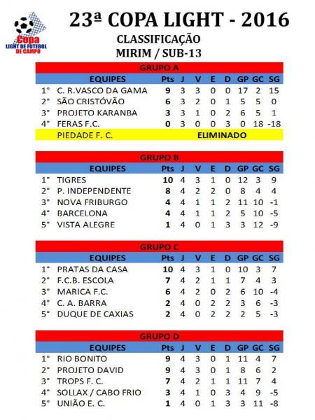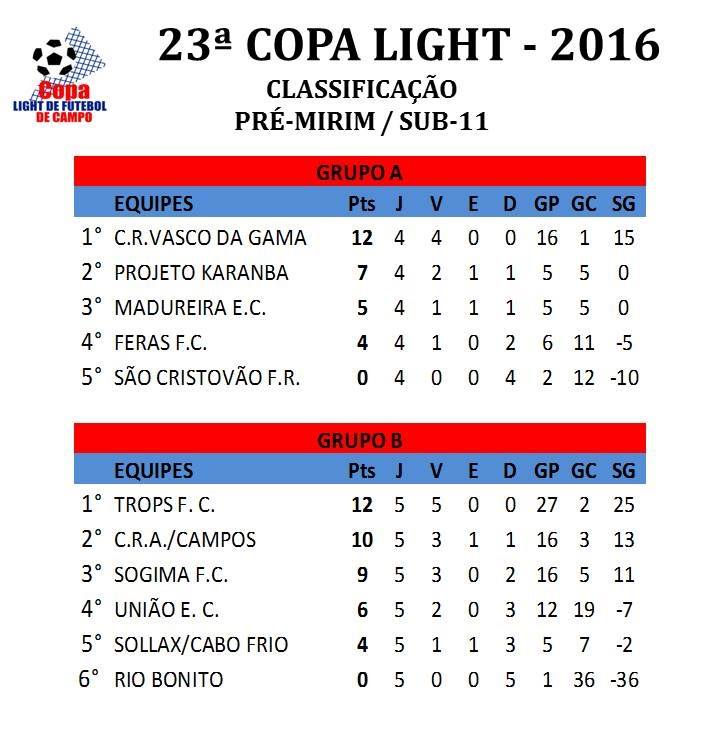Vasco lidera seu grupo na Copa Light em todas as categorias