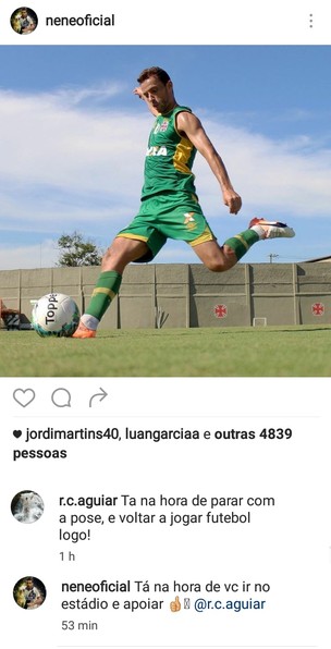 Na segunda colocação da Série B, a situação do Vasco já foi melhor na competição. A equipe está três pontos atrás do líder Atlético-GO e a cinco rodadas do fim do campeonato a torcida faz certa pressão por causa do rendimento atual do Cruz-Maltino. Neste Dia dos Finados, Nenê postou em seu Instagram uma foto de treino com uma oração na descrição. Nos comentários um torcedor disse para o meia "parar com a pose e voltar a jogar futebol logo". O camisa 10 respondeu a crítica com: "Hora de você ir ao estádio e apoiar".