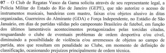 Pedido do Vasco é "em função dos últimos lamentáveis acontecimentos protagonizados pelas torcidas citadas." #gevas