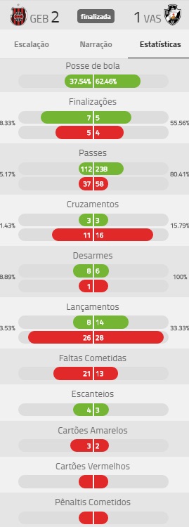 Confira as estatísticas do jogo Brasil de Pelotas 2 x 1 Vasco