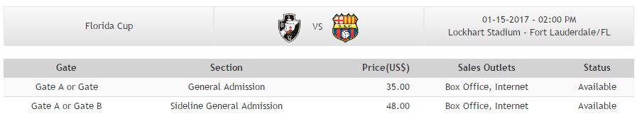 O site da Florida Cup já anuncia a venda de ingressos para os jogos do torneio. O Vasco estreia no dia 15 de janeiro, às 17h (de Brasília, 14h pelo horário local), no Lockhart Stadium, contra o Barcelona de Guayaquil, do Equador. Ganhando ou perdendo, volta a campo no dia 18, no Bright House Networks Stadium, para enfrentar Corinthians ou River Plate.