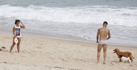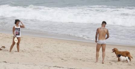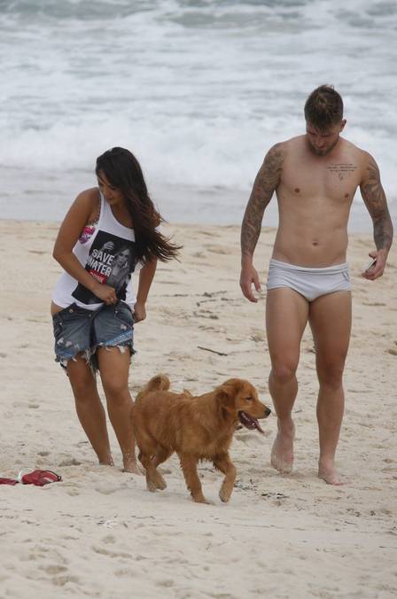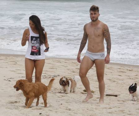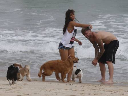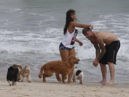 A dúvida é saber quem mais bate um bolão. Carol Nakamura e o zagueiro do Vasco Aislan Lottici exibiram seus corpos perfeitos no fim de tarde na Praia da Barra, na Zona Oeste do Rio. O casal jogou frescobol e se divertiu com seus três cachorros. Juntos há um ano, eles já se consideram praticamente casados.