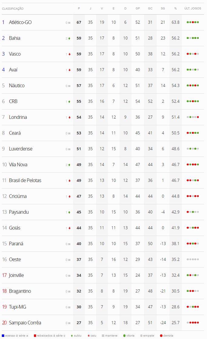 Terminada a 35ª rodada do Brasileiro da Série B, o Vasco caiu da 2ª para a 3ª colocação. O novo vice-líder é o Bahia. A diferença para o líder Atlético-GO (que já garantiu matematicamente o acesso) subiu de 6 para 8 pontos. Já a diferença para o 5º colocado, o Náutico, caiu de 4 para 2 pontos.