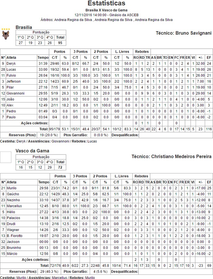 O panorama da partida seguiu o mesmo no último período. Drudi ainda conseguiu levantar a torcida do Vasco mais uma vez com linda enterrada no início da parcial. Mas foi só. O Brasília continuou com domínio da partida, controlou o relógio e garantiu a vitória com autoridade por 95 a 72. Ao fim, a torcida vascaína reconheceu o esforço do time e cantou alto o hino cruz-maltino.