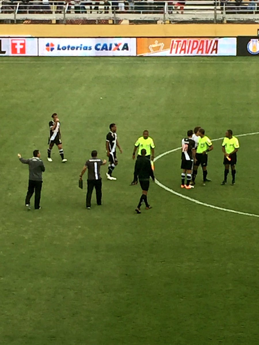 Cahê Mota @cahemota Jorginho e Nenê contestam arbitragem por pênalti e gol anulado. Leandrão se exalta e quase é punido. Rodrigo também argumenta #trnabi